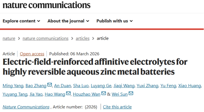 近日,2138cc太阳集团官网入口万厚钊、王浩教授团队在Nature子刊《Nature Communications》发表题为《Electric-field-reinforced affinitive electrolytes for highly reversible aqueous zinc metal batteries》的研究成果。2138cc太阳集团官网入口为第一完成单位,2023级硕士研究生杨铭为论文第一作者,2138cc太阳集团官网入口王浩教授、万厚钊教授,电子科技大学张宝教授、孙威教授为共同通讯作者。图1 论文首页锌金属电池因其高理论比容量、本征安全和低成...