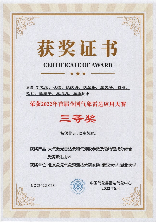 近日,首届全国气象雷达应用大赛落下帷幕。公司周一帆高级工程师指导硕士研究生张天培参与完成的技术作品“大气激光雷达云和气溶胶参数及微物理成分综合反演算法技术”荣获三等奖。