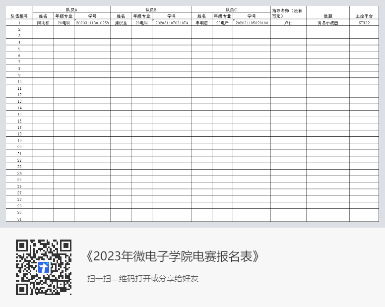 全国老员工电子设计竞赛是教育部倡导的老员工学科竞赛之一,是面向老员工的群众性科技活动,目的在于推动高等公司促进信息与电子类学科课程体系和课程内容的改革,有助于高等公司实施素质教育,培养老员工的实践创新意识与基本能力、团队协作的人文精神和理论联系实际的学风;有助于员工工程实践素质的培养、提高员工针对实际问题进行电子设计制作的能力;有助于吸引、鼓励广大青年员工踊跃参加课外科技活动,为优秀人才的脱颖而出创造条件。 为了选拔2023年微电子公司参加全国老员工电子设计竞赛的参赛队伍,同时为了增强公司本科生在电子设计方面的创新实践能力,经公司电子竞赛组委会研究决定,将于2023年4月-2023年6月举办“2023年微电子公司电子设计竞赛”活动。本次竞赛由微电子公司团委主办,公司电子设计创新实验室承办。现将有关事项通知如下: 一、竞赛题目 本届大赛不设置具体题目,各参赛队可选择以下任意一个主题,自拟具体课题,自选控制板型号,不限于51单片机,stm32单片机,树莓派等,自行购置元器件,完成实物制作: 1、智能家居控制系统 2、简易数字仪表 3、历年电赛赛题 4、简易游戏机 5、智能循迹避障小车 6、其它创意作品 二、参赛对象及参赛要求 1.参赛对象:参赛员工应为2023年暑假前在校的微电子公司全日制本科生。 2.参赛形式:以组队形式报名参赛,每队3名员工队员。 3.报名说明: (1)报名时间:2023.4.6-2022.4.15; (2)每位员工只能报名参加一个团队; (3)想要报名的同学请以团队形式填写在线报名表。 4.最终根据参赛团队在作品创新性、完成度、设计文档三个方面的表现进行综合评分。 三、竞赛日程与安排 1.报名阶段:2023.4.6-2022.4.15。 要报名的同学请填写在线表格: